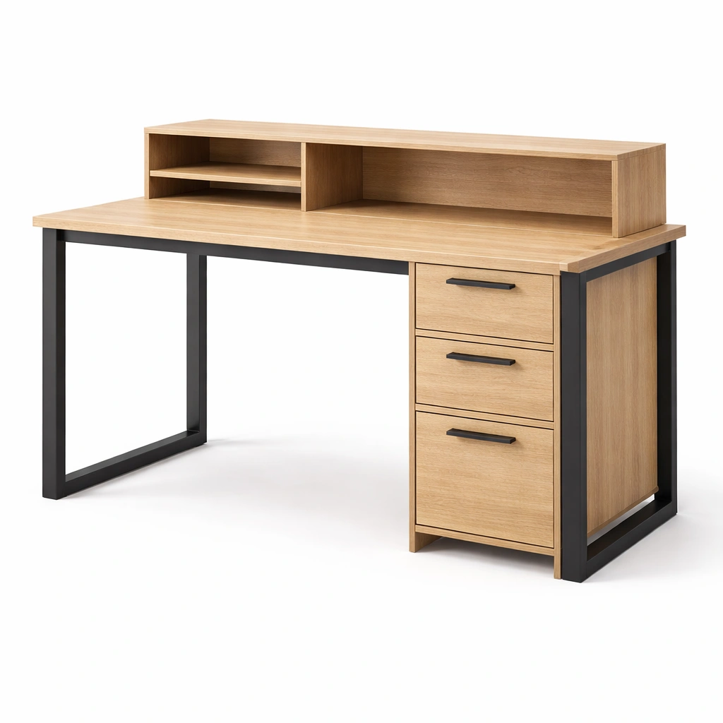 Schreibtisch aus holz mit regalen und metallrahmen drei schubladen