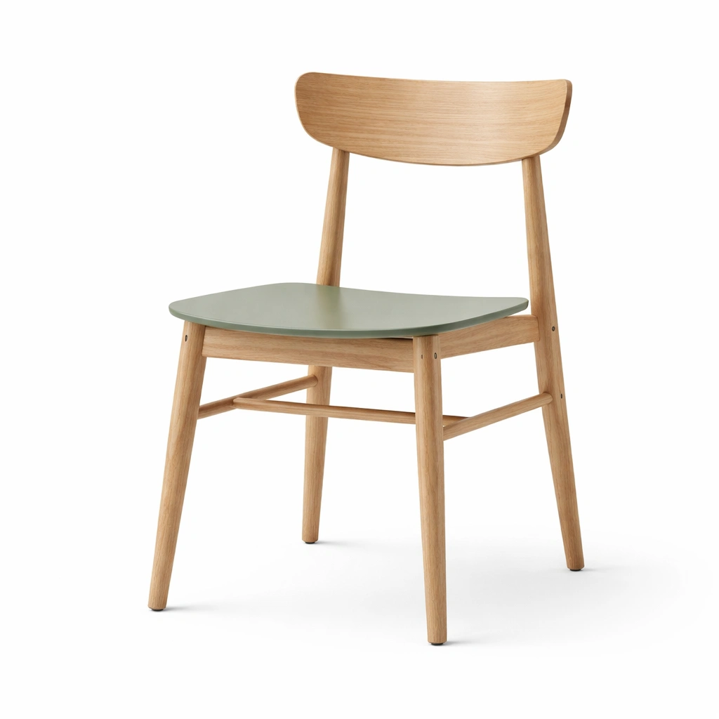 Der Stuhl hat eine Sitzfläche aus Polypropylen und ein Gestell aus Eichenholz.