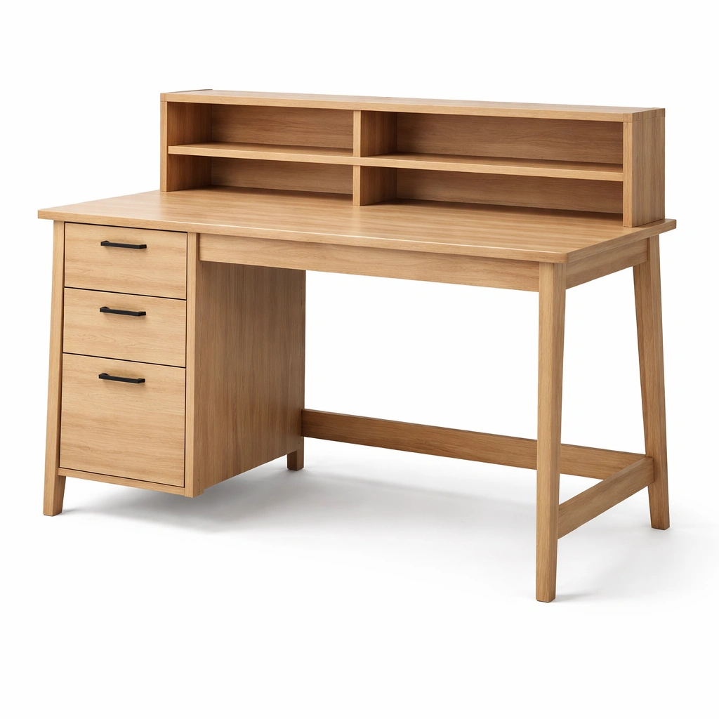Schreibtisch aus eichenfurnier und massivholz mit schubladen und regal